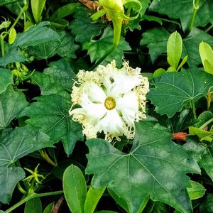 ヘビウリ 蛇瓜 ウリ科カラスウリ属の蔓性1年草 インド原産 熱帯地域で食用に広く栽培されている栽培種 日本へは明治時代に渡来 1つ目 昨年秋に出会ったヘビウリの果実です。 お正月、今年の干支『 巳 』に 因んで 投稿しました。長さ1〜2mにもなり 本当、蛇みたーい! 2つ目 夏、カラスウリにそっくりなお花を咲かせると知り、そろそろかなぁって、7月半ば 会いに行きました。 カラスウリのように夜咲くのではなく、日中咲いてます。 朝だったので レースがまだ広がりきっていないのかなぁ? クルクルッとカールしてますね 雌雄同株 雄花は総状花序、お花が8~15個つき、花序柄は長さ10~18㎝。 雌花は葉脇に単生、しっかり太めの子房がお花の下にある。 って、ことは この写真は雄花のようですね 雌花は見つけられませんでした。咲き始める時期がちょっとズレてるのかなぁ? 3つ目 仲良くゴーヤーの雄花と ツーショット 4つ目 日中に咲いてる ⬆️ ヘビウリ 夜咲いてる ↙️キカラスウリ と ↘️カラスウリ 撮影 2023 9/2 カラスウリは夜咲きますが、ヘビウリは 日中咲く一日花。 お花の大きさは、直径3~5cm(レース部分は含まず) なので、ぱっと見 、 カラスウリ(5~10cm)や キカラスウリ(5〜10cm) より 小ぶりだなぁって感じます。 お花 撮影 2025 7/12 葉っぱ・果実 撮影 2024 10/14 都立舎人公園野草園 ★ どうぶつシリーズに追加!