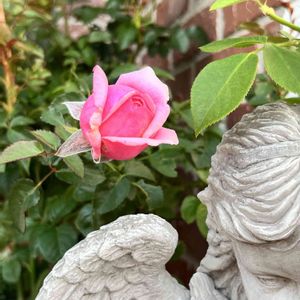 ピクニックマーチ🌹 天使の後ろにあるピクニックマーチさん❤️ お花が重たくて垂れてしまい天使の羽根の上でお休み中😊 そしてスッキリとした良い香り💕
