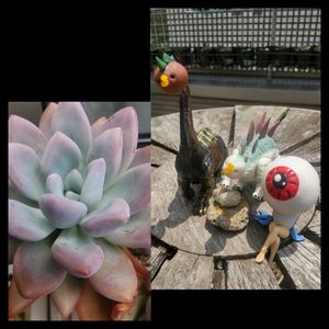 こんにちは 私の予定より暑い日になり 昨日軽い水やりは失敗したわと 朝からウロウロしましたぁ 遮光を増やした💦😵💫 この寄せ植えもちょっとさっぱりしないとヤバイ その前に オヤジフェス参加しようと またまた 1分でこさえたよ オヤジとゴル子 しまったしまった マイマイタンが滑り落ちてたわ😱 3枚目今年のジャガイモはめちゃ美味しかったです まさか中がこんな明るい紫とはびっくりしました そしてホント美味しかった 来年も これにしよう 最後のは 水やりしようと取りに行って戻ったらこうなってた😵💫🥶🥶🥶🧐 何やら虫にやられた? 不思議ですぅ タグは後ほど付け直す ちょいとお出かけしてきまーす💦💨