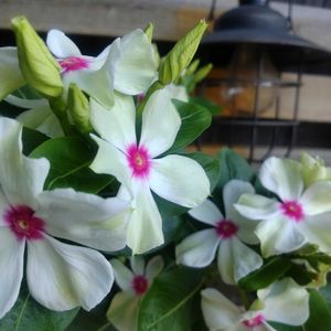 今日も朝から晴れて暑いです 軒下のフリルのニチニチソウとバラ咲きゼラニウム