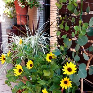 丸坊主✂にしたユーカリポポラスが一斉に新枝と葉っぱを展開中 この猛暑の中、流石のオージー気質✨ ヒマワリも負けじと咲いてます ハダニ被害を受けた葉っぱが痛々しいけども…