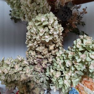 こんにちは(*^ω^*) ドライになってほったらかしだった紫陽花でリースを作りました! アナベル、漂白アナベル、柏葉紫陽花