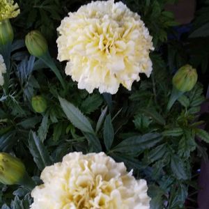 マリーゴールド ホワイトゴールドミニが咲き始めました😊最初はグリーンに咲きクリーム色に変化していきます✨ 背後のオレンジ色はニシキシダ この時期の葉色がとても美しいです🍀