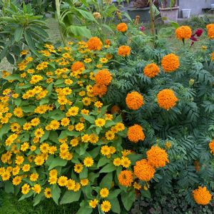 零れ種でどんどん増える アフリカンマリーゴールド🌼 背丈の高いのから低いのまで😳 色んな形の花が咲いています😅 フリルの帽子をかぶっていたり 超ショートな角刈りさん モシャモシャアフロさん🧑🦱 どれが本来の アフリカンマリーゴールド でしょうか😅 🏷ビタミンカラー