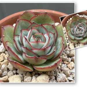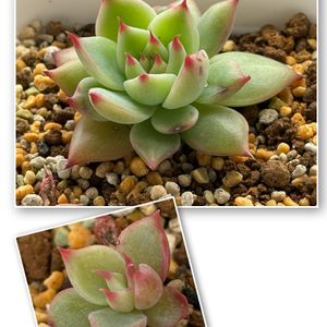 ペレスデラロサエピンクエッジ❣️ 昨年12月(右上)のミドリンからだいぶ変身しました😊 落ちた葉っぱ🍃からも子株が出てきて、ペレスデラロサエピンクエッジ丼(長っ💦)も夢ではなくなりました🥰