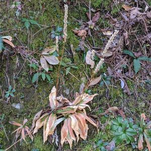 こ〜れ〜は〜何❓ 花も終わってしまってて…😥 ノギランと教えていただきました🤗 どうもノギランの花が咲いた時には縁がなかったようです😩 R3.7.31 追記 枯れたノギランの花序の下、同色になった根生葉が写っているのに気がつきました。 花は、今、このクソ暑い7月に咲いていると分かった次第🥵