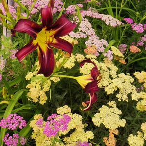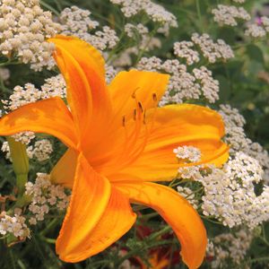 公園で、ヘメロカリスがセイヨウノコギリソウに包まれて咲いてました🥰 白いセイヨウノコギリソウが優しい雰囲気を演出してます💖