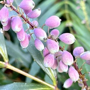 ヤナギバヒイラギナンテン 西宮の家の近くに新しく建てられたマンションの植栽🟨 散歩していると黄色い房状の穂が見えた金曜日の蕾たち🏷 僅かに開いている花弁の中央には、大きな雌しべの柱頭が見える🟢 外側に倒れている雄しべは、ムシが触ると雌しべの方に寄って花粉を付けるのだという💛 外側の萼片はオレンジ色になって、すでに若い実が出来始めている🟣 ホソバヒイラギナンテンと迷うところだけれど、小葉の数が多いことと、葉の縁にある棘を触っても痛くないので、ヤナギバヒイラギナンテン(マホニアコンフューサ)、業平の品種だろうと思う🟩