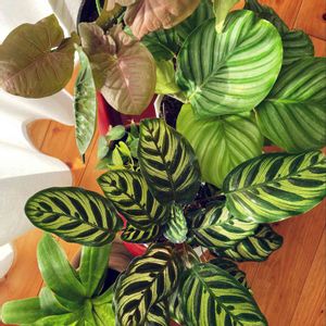 カラテア ワルセウィッチーさん ワルセヴィッチー? 朝日が1時間くらい当たる特等席✨ど真ん中の特等席✨ でも光が苦手らしく、まぶしーっ!!!ってクルクルしちゃいます😅このクルクル見たら他の子にごめん!と思いながらカーテン閉める。。。 ちなみに茶色くなった所は外のほぼ日陰管理してた時の新芽さん。 直射も少し当たってダメになったみたいー😅なので室内に移動✨ サイズ的にこののスペース入る子少なくて、綺麗だから真ん中に配置したくてこの位置なんだけど、他の子のせっかくのゴールデンタイムなのにー。と悩ましい😓