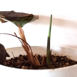 希望の新芽☆ 日に日に枯れて最後の1枚も枯れ始めて、もう全滅かな...と思っていたカラテア サンデリアーナ。 諦めて処分するか・・と思っていた矢先、スルッと一直線に伸びるシガールを発見! (てか、こんなに伸びるまで気付かなかったとは驚き) 上手に育てられなくてごめんなんだけど、まだ頑張って生きようとしている✨ その生命力に感動~! どこまで持ち直すか分からないけど、見守ります。 カラテア難しい~