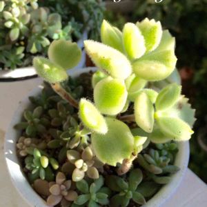 熊童子錦(*^o^*) 柔らかくプックリしていて、ペパーミントグリーンのギザギザがお菓子の様で一目惚れ💓 足元は姫秋麗で埋めてみました(*^_^*)