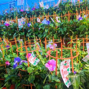 こんにちは😃浦和美園店 遠藤です☘ 入谷の朝顔市は、この時期の風物詩🎐 本来なら、7月6日から3日間開催されるのですが、今年もコロナウイルス🦠の影響で中止となってしまいました😩 来年は開催されることを願うばかりです✨ お客様に少しでも、朝顔市の雰囲気を楽しんでもらえたらと思い行燈仕立ての朝顔を並べてみました☘ 生産者さん直送なので、とても新鮮です♪ 写真を撮ったのが、夕方になってしまいほとんどお花は萎んでしまいました💦 可愛らしいお花が咲いている、午前中にぜひ見に来てくださいね😉