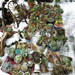 ただ今・・多肉ハウス組み立中&棚増設中・・ 雪の中に寄せ植えゾーン達・・放置中~~~ あと少しだからね~~~💦 緑と白・・コントラスト、綺麗だから・・思わずパチリ😁