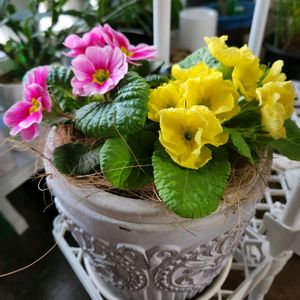 春待ち植物さん~ 『プリムラ ジュリアン』 20231121 昨日、投稿ボタンを押しても出来なかった分です。不具合? 植え付けから約10日経過🗓️ ピンクさんは元気で強いようです🌸 茎も花びらもしっかり💪 香りがするのは、レモン色さん🌼 花びらも柔らかくほわほわ。 本当は風除室組でしたが、母がリビングに居てほしいようで、リビング組に 昨年買っておいたアンティークな鉢にヒラヒラほわほわの花びらがピッタリな感じ✨どちらも引き立て合って☺️ 濁りのないポップカラーが冬のリビングを彩ります💓 あったかい安らぎ感と心踊る感じ🎶