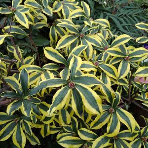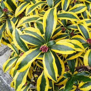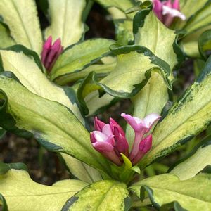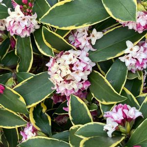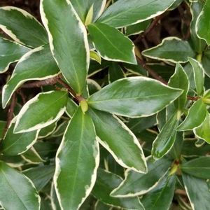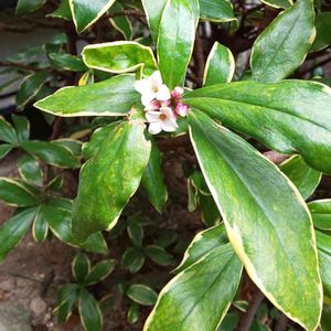 覆輪ジンチョウゲです。 葉のまわりが黄色く縁取られることから覆輪(ふくりん)の名がつく。 秋の金木犀のように芳香放ちます。枝先に小さな花が手毬状に固まってつきます。