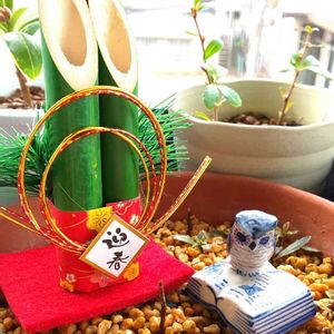 フクロウ祭、参加させてくださ~い!😃 フクロウさんの居る、荒涼とした鉢は、6月に挿し木したサツキの鉢なんでーす!😭💦 何だかはかばかしくない雰囲気が漂ってますが、まだ生きているので様子見です。 真ん中の棒になった子を引っこ抜いてみたら、根っこがモシャモシャ生えていたので、また埋戻しました。😅 棒でさえ根っこが出ているので、葉っぱ付きのは大丈夫だろうと、自分に言い聞かせつつ。 あまりにショボい光景なので、派手に見えるよう、門松🎍を立てました。😁