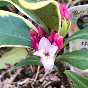 沈丁花咲いてました。斑入りは珍しいかな?マスクしていてもいい香りです。赤いつぼみも可愛いくて散歩中にいつも和ませてもらってました。 近所のお店前にて