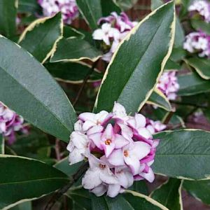 小さな花が固まりになって枝先に咲き甘い香りで春の訪れを告げる。赤花種のジンチョウゲ(沈丁花) 葉に班が入っています。 夏のクチナシ秋のキンモクセイ 三大香木(さんだいこうぼく)