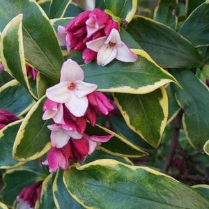 咲きました〜🌸 斑入りジンチョウゲ👏 やっとです🤣 これは去年幸田町に有る憩いの農園で購入。 よく枯れずに頑張ってくれました🥰 しばらくよい香りに癒されます🤗