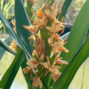 「遊歩道脇で見つけた」 撮影📱2024.8.18 熊本市・上江津湖の 遊歩道で撮影📱 ジンジャーリリー🌼 白い花🌼が遊歩道脇 の水際で咲いてたよ😀 流れる水は湧水やけん 白い花🌼が際立ち 素敵な雰囲気やったよ🎵