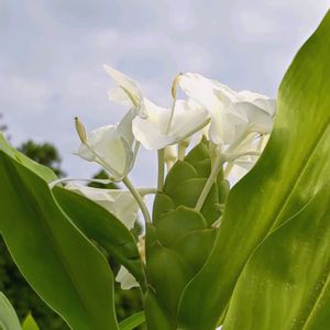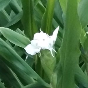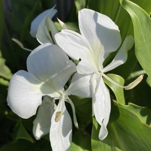 純白のジンジャーリリーが 辺りに甘い香りを漂わせています。 ジンジャーリリーは 江戸時代の末期に薬用として伝わったようですが 花の美しさと香りで観賞用として栽培されるようになったのだとか…。 唇形の大きな花びらのように見えるのは 雄蕊が変化したもので 本来の花びらは 細く糸のように垂れ下がった部分だそうです。 食べる生姜と科は同じショウガ科ですが 属が違い食べられません…。😆 インド ネパール マレーシア原産。 ショウガ科ヘディキウム属の半耐寒性多年草。
