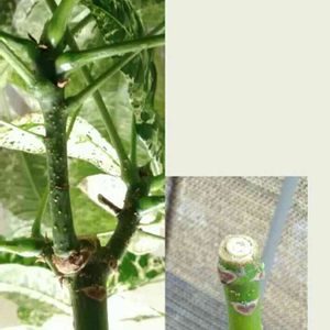 実生斑入りパキラ5年生の株元です! のの字様になっています? 種子の表皮が引っかかって真っ直ぐ伸びなかったのかもしれません?