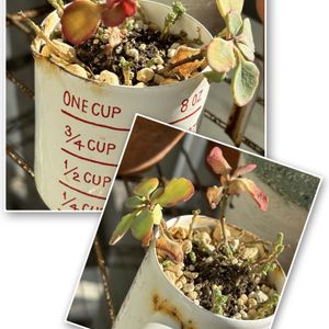ミセバヤ×4❣️ 1枚目 紅葉、枯れかかった葉、子株ちゃんが同居中🏠 2枚目 まだまだ頑張ってますよ😉 3枚目 子株ちゃん成長中😊 4枚目 昨年11月末ごろにお迎えしたミセバヤさん。 花も見せてくれていましたが弱って⭐️に😖 辛うじて1センチにも満たない葉を救出して挿して置いたものです。 成長が遅い〜〜〜っ‼️けれど、夏を乗り越えてよくぞここまで育ってくれました😂