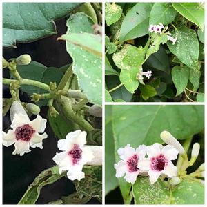 腹ペコクロイモムシが食べていたつるに咲く花。 ツツジに絡みついているのですが、あちこちに小さな花を咲かせています。