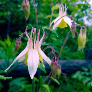 海の日シリーズ#11、白山高山植物園にて。白では無くて優しい薄黄色のキバナノヤマオダマキ。距(クルッとなってる所)は薄く紫色がかかっていて、実に品の良い色合いが素敵(๑˃̵ᴗ˂̵)