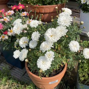 鉢植えにしたマーガレット達 大きな鉢に植えると大きくなるみたい どうなるか分からないけど これからがとても楽しみ 鉢植えは、水やりが気になるけど 動かして遊べるから 良いですね 梅雨前に切り戻して 秋にも咲いてくれるかな?
