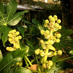 🌿ヤツデ(八手) ウコギ科 ヤツデ属 葉がおおがたで独特の形をしているのでよく目立ち見分けやすい 学名のFatsiaは日本語の「八」または「八手」に由来するそうです