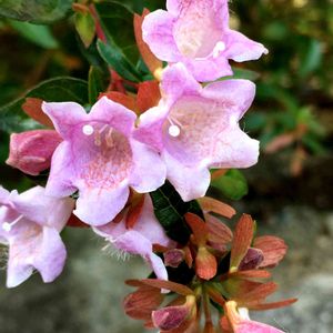 🌸アベリア・ユニフローラ ツクバネウツギ属 淡い紅色の漏斗状の花をつける 花冠は上部で5裂し、内側には短毛がある。雄しべや雌しべはやや花冠から突き出しているそうです