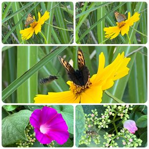 虫さんシリーズ 上段:オオキンケイギクさんにベニシジミ さんが蜜を吸っています💕 中段:そこに🐝さんがやって来たら、 ベニシジミさんがビックリ‼️して 翅を少し広げました。 下段左:昨日の朝撮って投稿した ヤブガラシさん&朝顔さんの 斜め顔。 下段右:夕方、仕事帰りに撮った ヤブガラシさん&萎んだ朝顔さん& 🐝さん ヤブガラシさんの所に🐜さんも 来ていました。