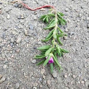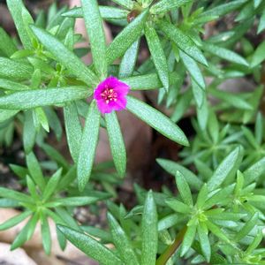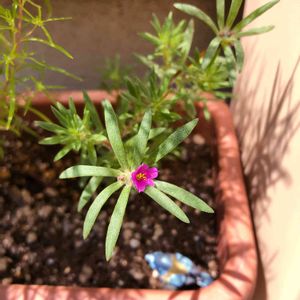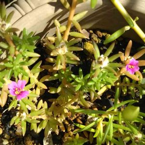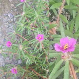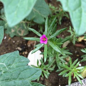 1ヶ月程前に散歩途中に発見! 道路のアスファルトの割れ目に咲いていました。 お花は5ミリ程と小さく初めてみる品種でした。 もしかして原種⁉️ 車や人に踏み潰されそうな場所だったので、 一部拝借して自宅の松葉牡丹の鉢植えの隅に植えてみました。