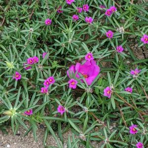 昨日のお出かけ 他所さまの玄関脇のスペース 沢山のヒメマツバボタンの中に普通サイズのマツバボタン どうしてこんな事に?