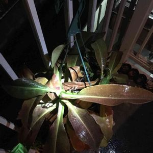 レベッカソーパー とても丈夫でいつも秋のような色合いで控えめなデザインの袋をつけるネペンテス 背景のラウイは花咲いてますが葉先の粉が取れてて残念です。雨かからないトコにスペースないし雨の時だけ移動させるほど過保護に育てる気がないのでこのままです。