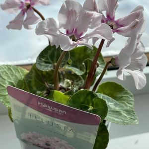 🌼お迎え記録🌼 いただいたカタログの表紙を 飾っているのを拝見したときから 目を奪われました😊 #ハクサン さん #シクラメンイリュージア 可愛らしい色合いのピンクと 上向きが魅力的な シクラメンです これから、楽しみです♪