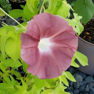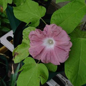 ホムセンで「団十郎」の名で 売られていて、思わず衝動買い してしまった朝顔が、 ようやく今朝開花しました❣️ 白い縁取りと斑入りの葉っぱが お洒落です🥰🌺🌺