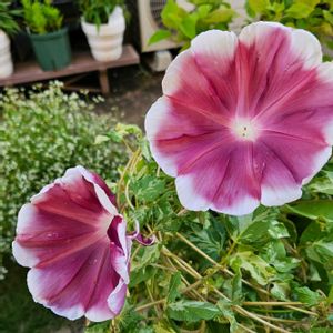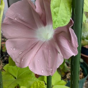 団十郎朝顔の葉が生い茂ってきて、ふと思ったのが、せみ葉が多くて、とんぼ葉が数える程しかない。しかも斑入りが多い。 とんぼ葉の方が、なんとなく朝顔らしくて好きなのですが、、 1本のツルから両方出ていたりします。 花の方も日輪抜けか、無地かでいろいろあるみたいですが、我が家は日輪抜けです。 本物の団十郎なのか、否か、気になり検索してみると、諸説紛々。 せみ葉ととんぼ葉もサイトによりネーミングが入れ替わっていたりします。 結局本物、偽物はなく、赤茶色の朝顔はみんな本物の団十郎らしいです。 楽しかったらいいや、ネ😉