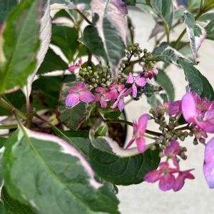 おはようございます😃 良いお天気です☀️ 28℃まで上がる予報です。 今月もよろしくお願いします🤲 ①大栄花園のカラフルランジア、オーロラです🌸 葉に斑が入って綺麗です🌿 ②枝が違うと葉も花も違うのが出ています!? ③上から見た感じです♪ ④根元はこんな感じです👀 ヤマアジサイとハイドランジアの交配種なのでこう出るのでしょうか? 今日もお元気で💕