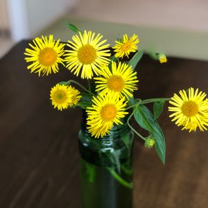 名前が分かりました。 ありがとうございます😊 オグルマ(キク科)[小車] と教えていただきました☺️ 人工知能からの9種類、調べてみましたが全て当てはまらずでした。 昨日、知人の畑に伺い、その際に見た花です🌼 株分けしてくれるとの事でしたが、忙しかったので少しだけ、頂いて来ました☺️ 家に着いたら、ダメかと思うほどしんなりと、でも物凄く水上げが良く、切り花にも長持ちしそうです☺️ 知人は、「植えた覚えが無いけど、増えてきて綺麗だね☺️」って言ってるのですが、畑の際の細い小川寄りに咲いてます。 葉は少しざらざらと🌻の葉のようで、茎に交互に細い葉です。 倒れ気味に草丈40〜50㎝くらいで、宿根草みたいですが、昨年は見ても気が付きませんでした❗️ 確か、毎年咲くよって聞いた気がしますが?
