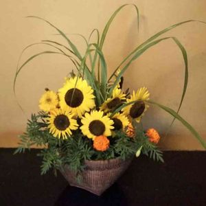 おはようございます😊✨。 昨日花壇の手入れをし 下の方の葉が枯れてしまった ひまわりを切り花にしました。 中の草を抜こうとして、 折ってしまった😂 マリーゴールドと すすきを添えました😊。 今日も素敵な 1日をお過ごしください🍀✨✨✨✨✨。