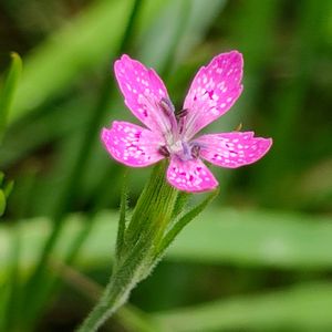 ノハラナデシコ 🌱ナデシコ科 ナデシコ属 ✽高さ20〜50cmの一〜越年草 ✽茎は直立して上部ほど短縮毛が密生する ✽根出葉は柄がありへら形 ✽対生する茎葉は無柄で線形で毛がある ✽花は枝先に2〜数個つき、5個の花弁は平開して中央部が白く、花弁全体に白点が散在し、中部に濃紅色点があり環状の模様となる 草刈り後だったので、見られたのは数株でした💗