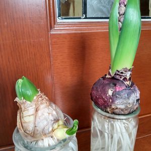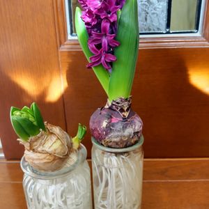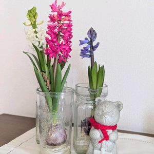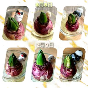 おはようございます😊 水耕栽培のヒヤシンス🪻は、全部咲きそろいました。白とピンクは夫々2本ずつ咲いてます。最近のヒヤシンス🪻の球根では、何本もの花茎がいちどに出て咲く『マルチフローラタイプ』の品種も育成されてるそうです。 空いた瓶で新種の球根🧅栽培始めました〜🤭😆4枚めアップで😁大好きなリトルミーが育ちます💕 (2025/1/27撮影)