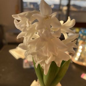 先に白いヒヤシンスが開花 下の方からもう一つ花茎が育っています♬ 冬至梅も今頃になって開いてきました。ヒヤシンスは甘やか、梅はキリッとした芳香は楽しみのひとつです☺️