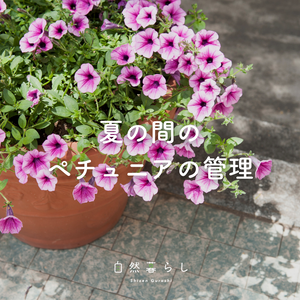 夏の間のペチュニアの管理👒 ペチュニアは4月~11月上旬頃の基本的に暖かい季節に咲く花ですが ✅強い日差し ✅高温 ✅多湿 には弱い性質があります。 夏の暑い時期は直射日光を避け、風通しを良くすることが大切です。 強い直射日光は葉焼けを引き起こすことがあるため、半日陰の場所に移動するか、遮光ネットなどを利用して光を調整しましょう。 水やりも夏場は注意が必要です。 乾燥しやすい時期ですが、過剰な水やりは根腐れを引き起こす可能性があるため、土の表面が乾いたらしっかりと水を与えるようにします。 おすすめのタイミングは乾燥状態によりますが、1日2回朝早くと夕方の比較的気温が低い時間帯です。 💡雨が続く時期:水やりは控えめに、状況を見ながら行いましょう。 また、枯れたペチュニアの花をそのままにしておくと、種子ができるために栄養が消耗され、新しい花が咲きにくくなります。 さらに雨に濡れると葉や他の花にべっとりとくっついてしまい見た目も悪くなってしまいます。 定期的に花がらを摘んで美しさを維持しましょう。 ペチュニアの上手な育て方を詳しく解説♪ 《上手なペチュニアの育て方|肥料の与え方、プランター・鉢植えも》 https://shizengurashi.jp/blogs/flower/petunia