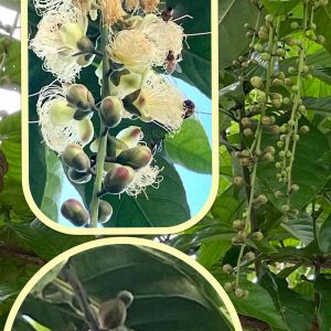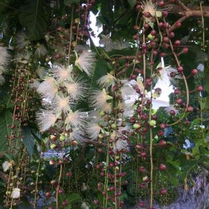 サガリバナ(サワフジ) サガリバナ科 庭木です。ちょっと苦手な子😅 写真の中の情報が渋滞しててすみません。忘備録として、記録させてください🙇♀️ 花は芳香があり、右側の様に長い花蔓が夏中、何十本も出て、花は太陽が沈む頃〜朝までの一晩のみ上から5.6個ずつ開花し、ポトっと落ちます。開花〜朝まで、蛾とミツバチが🐝めっちゃ混み合います。 花の蕾の蔓は120センチほどありました。花の直径は約5センチ弱。 木の高さはほっとくと二階の屋根を越えると思います。 (台風前後で剪定したり、台風で折れたりするので、3メートルくらいをキープしてます。花の蕾蔓も、台風で風に激しく揺れて当たると痛い😢ので、台風前にカットします) 川辺にあると、落ちた花が水に浮いて流れていくのはとても素敵です。 が、ここは庭。朝早めにお掃除しないと、落ちた花の蜜を求めアリンコ🐜大集合です。 でもまだ落下してない花に🐝と蛾がすごくて、なかなか掃除できないという現象が起こります。 もうお別れする?そのままおいとく?と検討中。 ほったらかしもなんだかな〜なので、ちゃんと記録しておこうかと。