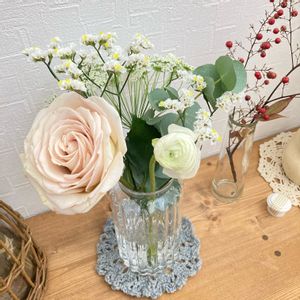 待ちくたびれたお花の定期便の初回がやっと届きました〜!! 大好きなスターチスが入ってて嬉しい。そのうちドライフラワーにしよう! ナチュラルコースで好きな感じのブーケが届いて満足です。 最近ハマってるかぎ編みで作ったドイリーもいい感じに合ってて尚満足です。