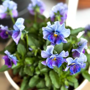 大好きなブルーの寄せ植えです。 使ったのはパスフリ淡青、 パピヨンワールド、丸森ビオラ。 花の形、大きさの異なる品種を集めました。 丸森ビオラ可愛すぎる〜💦
