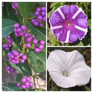 おはようございます😊🍀🎵 左側 ムラサキシキブかな🟣🌿🟣🌿🟣 右側 朝顔💜🤍 撮影日2025.10.11 お出かけ先にて🚗 撮影しました😊📱✨✨ いつも見て頂き ありがとうございます😊 今日もよろしくお願いします🤗🍓 良い1日になりますように🍀💖🍀